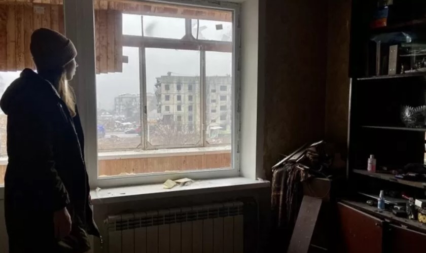 Анастасия в квартире родителей, где семья не живет, после того как взрывная волна повредила дом. С балкона виден разбомбленный дом, от взрыва в котором пострадал дом Анастасии.