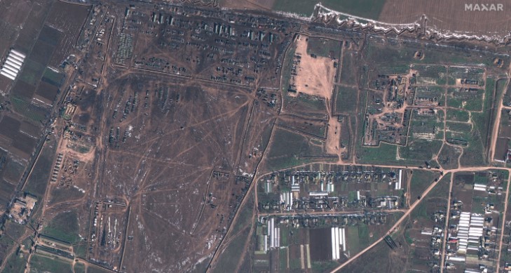На знімках із супутника Європейського Союзу Sentinel 2, зроблених 21 січня, видно значний слід російського обладнання. На знімках Maxar з вищою роздільною здатністю від 11 лютого видно десятки бронетехніки, включаючи танки та артилерійські знаряддя.