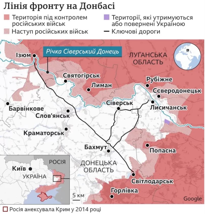Второй месяц продолжаются бои за город Северодонецк, административный центр Луганской области. Мосты через Северский Донец, разделяющий Северодонецк и подконтрольный Украине Лисичанск и остальную часть Донбасса, разрушены. Но власти Украины настаивают, что город не заблокирован.