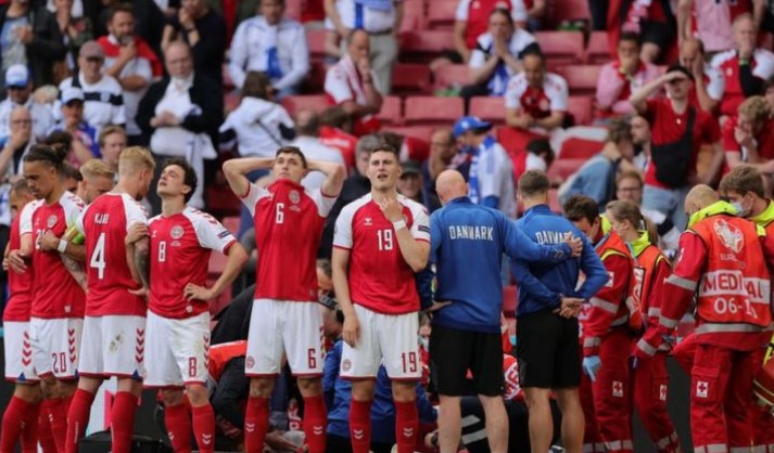 Матч группы “В” Дания – Финляндия остановили в самом конце первого тайма после того, как Эриксен неожиданно упал на землю и потерял сознание – перед этим в него попал мяч.
