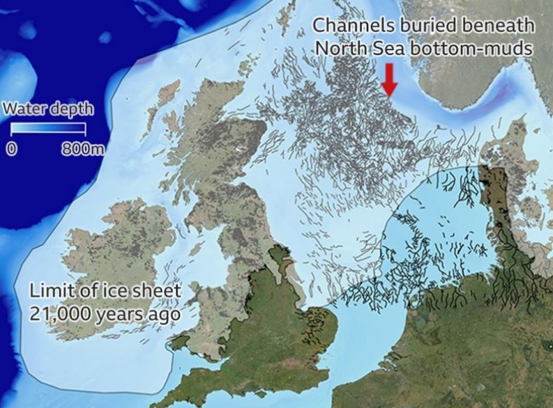 В Северном море остались десятки долин, которые образовались во время таяния ледников в Северной Европе тысячи лет назад – этот процесс во многом напоминает нынешнюю ситуацию. Также на рисунке можно увидеть, каким был ледник 21 000 лет назад