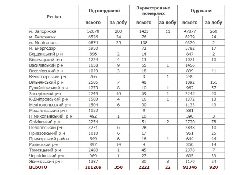 Всего с начала пандемии в Запорожской области подтверждены 101 289 случаев COVID-19. Побороли недуг 91346 жителей области. В больницах и дома на самоизоляции находятся 7718 больных.