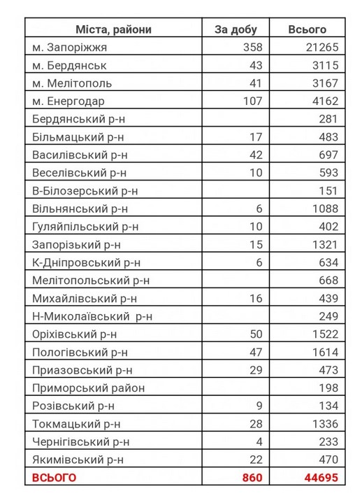 За минувшие сутки COVID-19 подтвердили у 860 жителей региона. По данным запорожского областного лабораторного центра 358 новых случаев подтвердили в Запорожье, еще 107 – в Энергодаре, также заболели 50 жителей Ореховского района.
