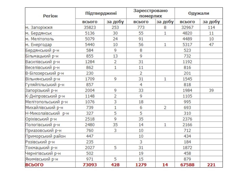 Кроме этого, за минувшие сутки от осложнений, вызванных болезнью, умерли 8 жителей Запорожья, 2 жителя Михайловского района, по 1 жителю Бердянска, Энергодара, Вольнянского и Пологовского районов.