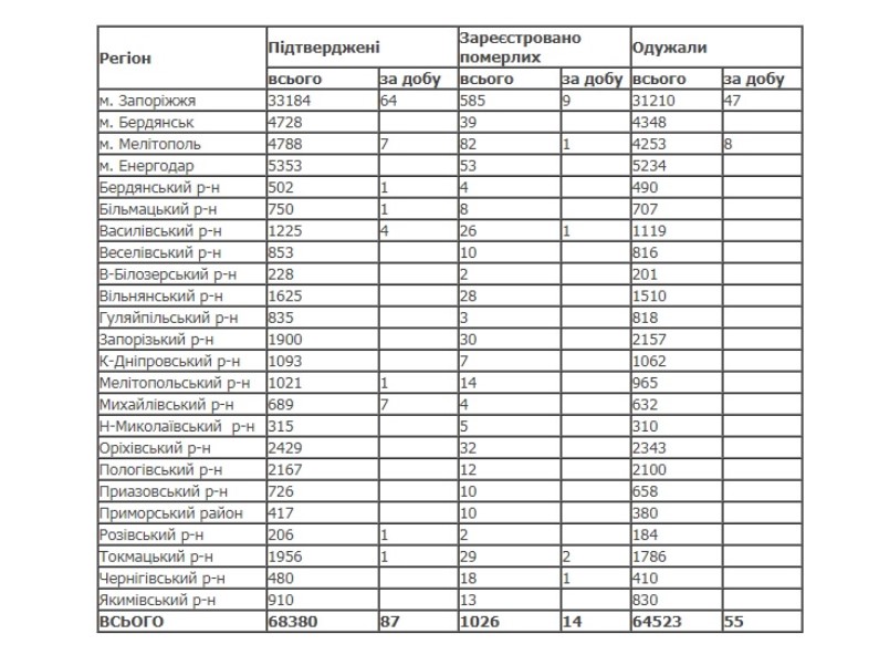 К сожалению, за прошедшие сутки от осложнений, вызванных болезнью, умерли 14 человек. Среди них 9 жителей Запорожья, 2 жителей Токмакского района, по 1 жителю Мелитополя, Васильевского и Черниговского районов.