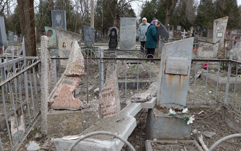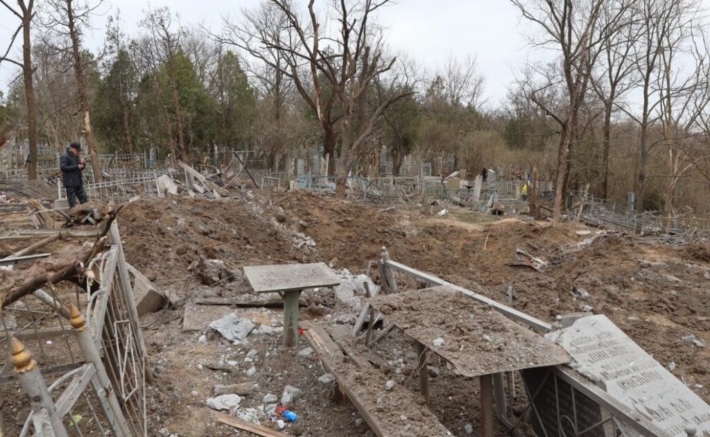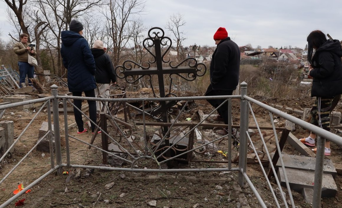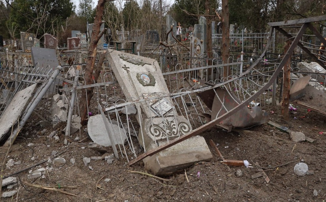 Внаслідок обстрілу утворилася вирва глибиною біля 4-х метрів та було зруйновано багато пам’ятників та надгробних плит.