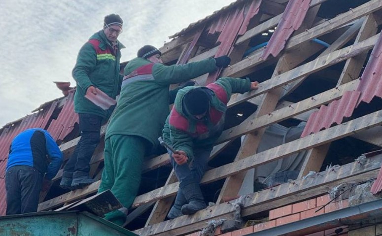 ◽️ Тривають роботи з улаштування тимчасової покрівлі плівкою на двох будинках.