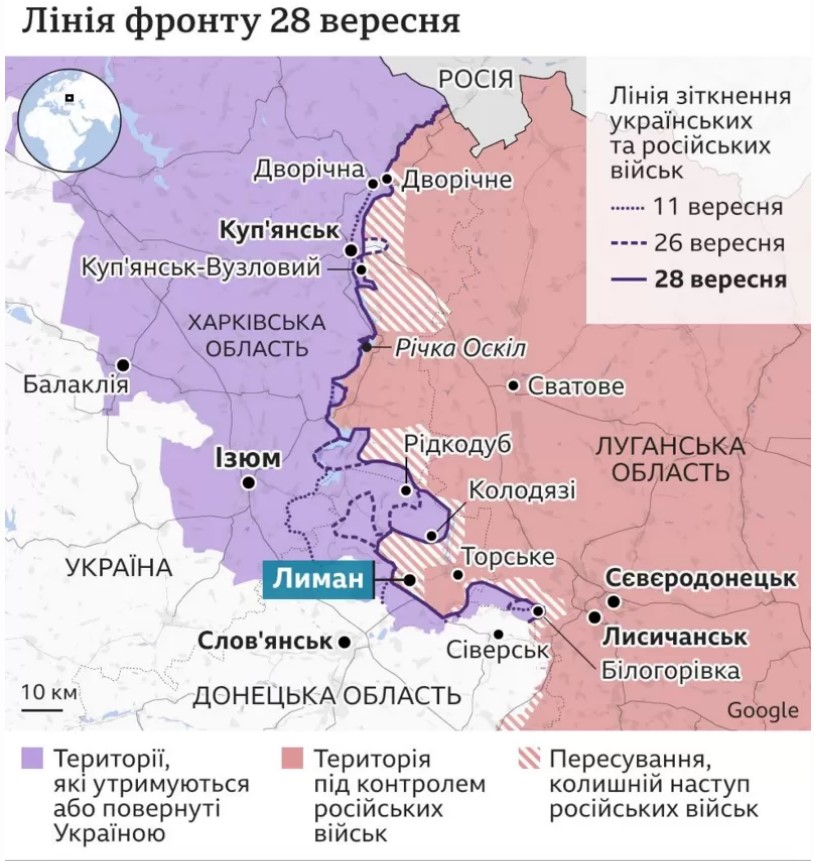 30 сентября президент Зеленский заявил, что украинские войска имеют существенные результаты на востоке Украины, в частности, в Лимане Донецкой области.