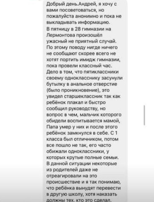Об этом на своей странице в соцсети рассказал житель Запорожья Андрей Лукин. Он уточнил, что ученики 5-го класса засунули своему однокласснику горлышко бутылки в анальное отверстие.