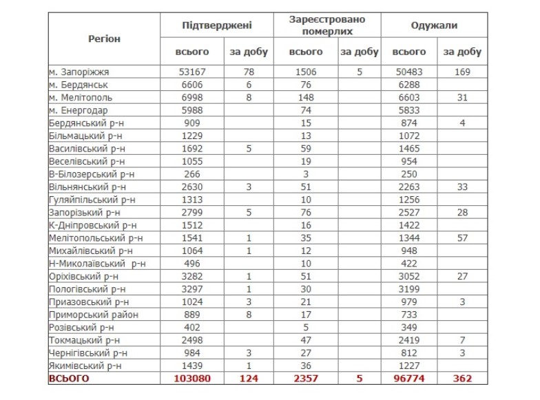 Статистика заболеваемости коронавирус в городах и районах Запорожской области: