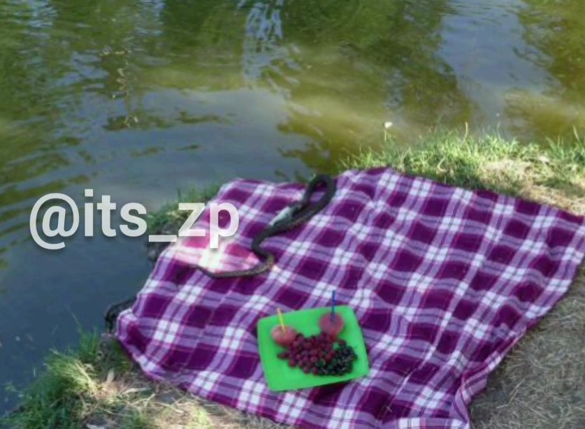 На фото можно рассмотреть как на расстеленную у кромки воды подстилку заползла приличных размеров змея.